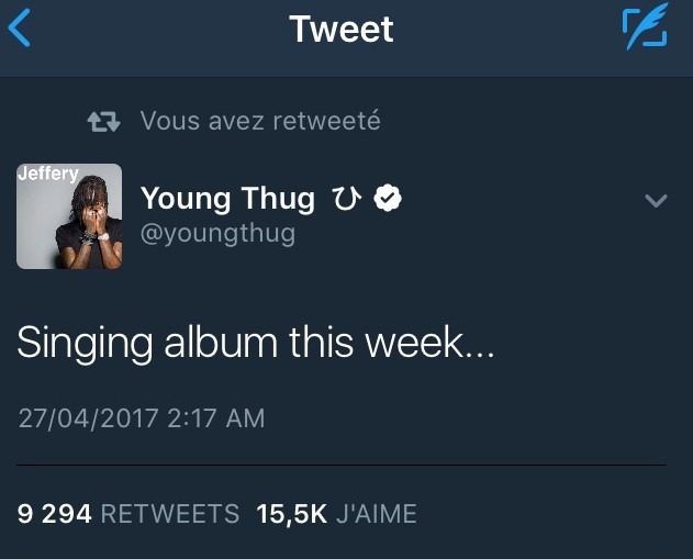 Young thug a annoncé la sortie de son album à la fin de la semaine ! La preuve sur ce tweet qu'il a tweeté cette nuit ! ll nous a confié qu'il dédira son projet à jerrika, sa femme.